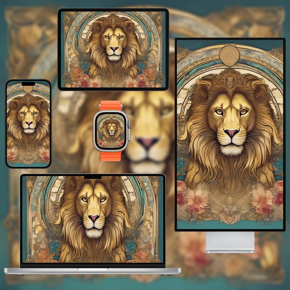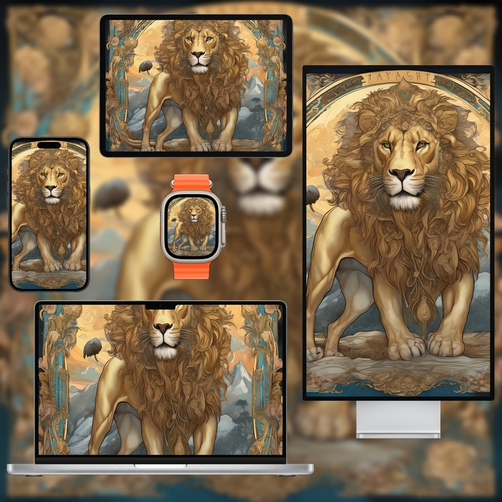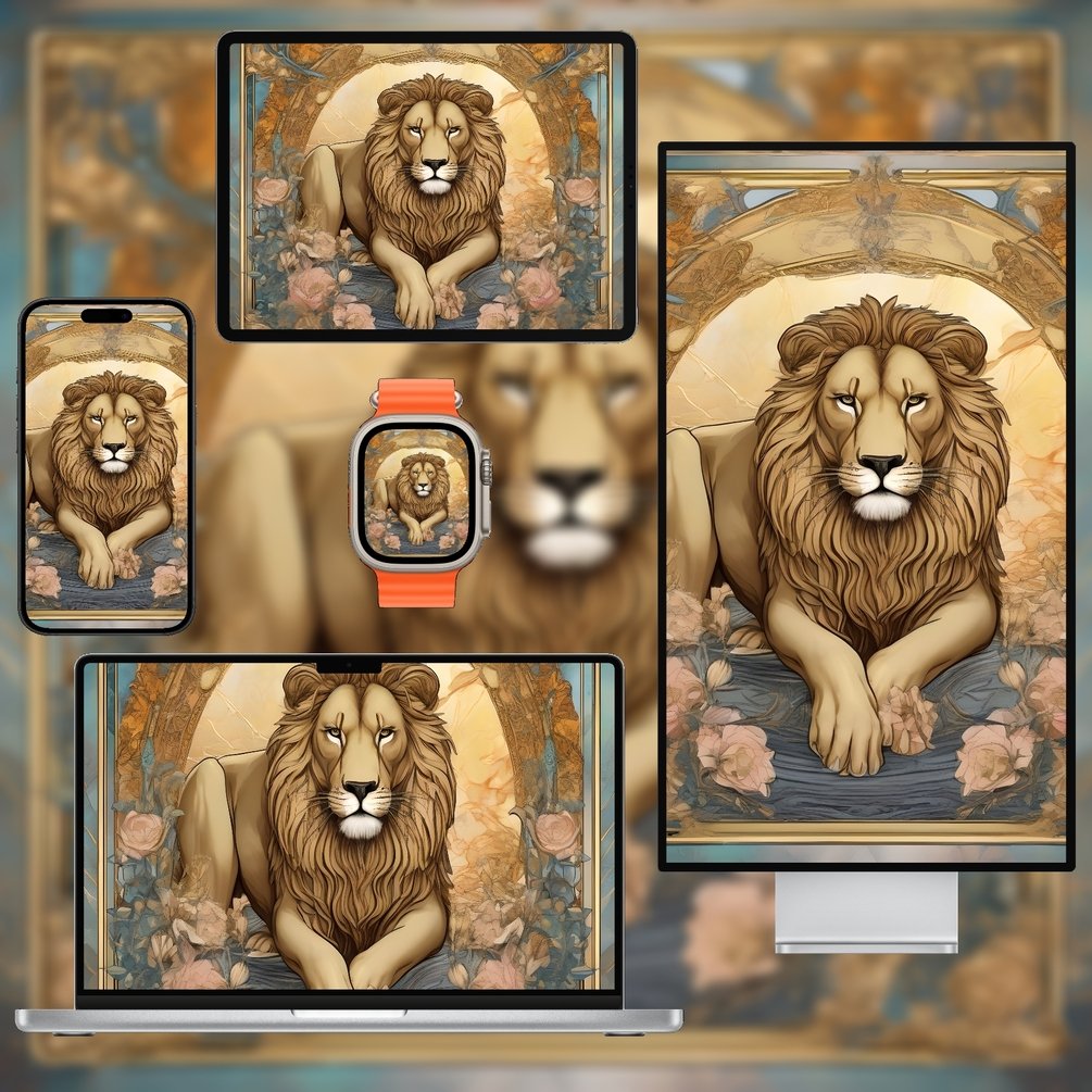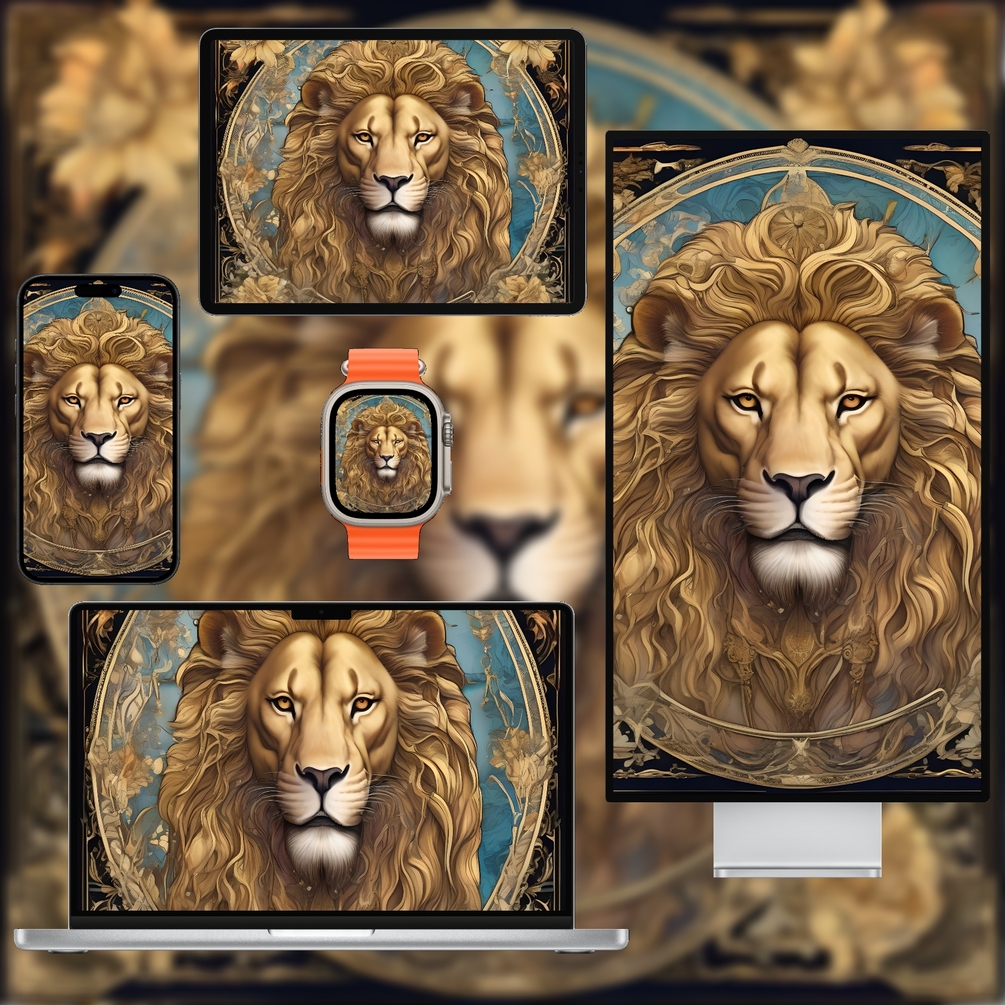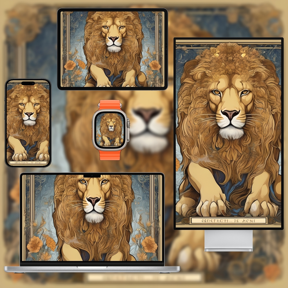 Strength (VIII) Tarot Wallpaper Pack features bold minimal designs inspired by the Strength card’s resilience and courage. Rich golden and earthy tones with clean lines highlight the archetypal lion and floral motifs without heavy ornamentation.