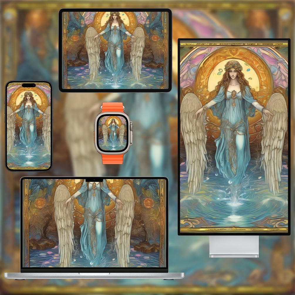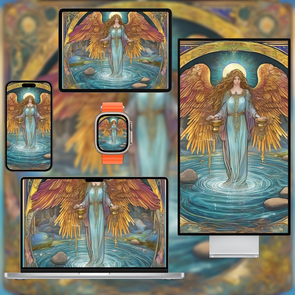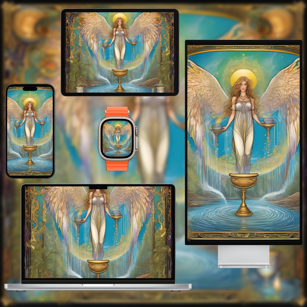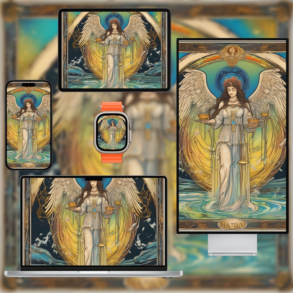 Bring harmony to your digital space with this balanced, minimal tarot wallpaper pack inspired by the Temperance (XIV) card. Soft pastel and gold tones create a calming palette, while refined composition ensures your devices look elegant and uncluttered. Supplied as high‑resolution PNG files in multiple aspect ratios for phone, tablet, desktop and watch, these wallpapers are free of text and logos. Instantly download and refresh your screens with serene tarot art suitable for personal use.