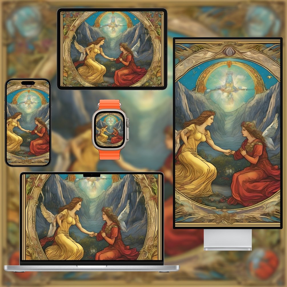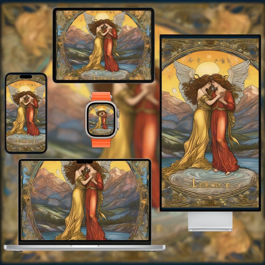 Delivered as high‑resolution PNG files, these wallpapers are optimized for phone, tablet, desktop and smartwatch screens in multiple aspect ratios. The serene, balanced compositions without text or logos create a peaceful aesthetic that supports focus while reflecting the significance of the Lovers card.
